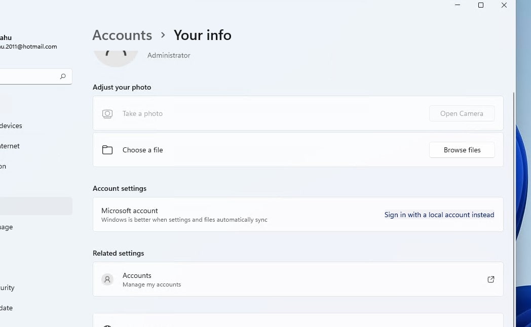 - V levé nabídce vyberte „Vaše informace“, poté sekci Nastavení účtu a klikněte na „Přihlásit se místo toho pomocí místního účtu“.