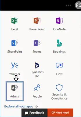 - Přihlaste se do svého Microsoft Office 365účet pomocí pověření globálního správce. Klikněte naAdminmožnost spuštění Centra pro správu Microsoft 365.