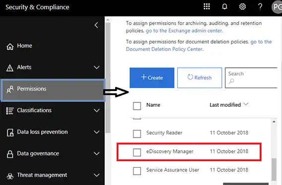 - Klikněte naOprávněnímožnost přetáhnout jej do eDiscovery Manager, jak je znázorněno na příslušné obrazovce.