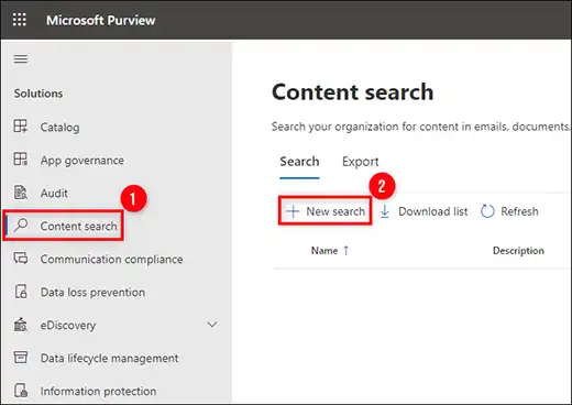 Pozor:Pokud nemůžete vidět „Vyhledávání obsahu”, pak se ujistěte, že jste úspěšně nastavili požadovaná oprávnění eDiscovery. Pokud jste navíc provedli nějaké změny vOprávnění eDiscovery. Promítnutí může trvat až 24 hodin.