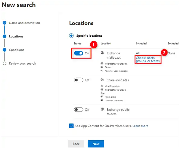 - Po kliknutí naNové vyhledávánímožnost, objeví se nový průvodce. Tento průvodce vám umožní přizpůsobit všechny součásti možností vyhledávání obsahu. Uživatelé mohou zadat název vyhledávání a popis. Možnost umístění vám umožňuje zadat data poštovní schránky, která chcete exportovat.