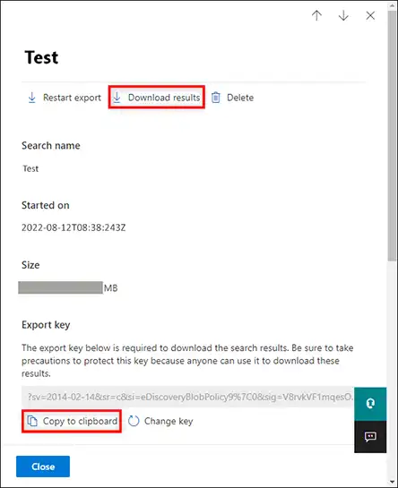 - Nyní,Nástroj pro export eDiscoveryse spustí automaticky po kliknutí na Výsledky stahování. Požádá vás o vložení exportního klíče, který bude použit pro připojení ke zdroji.Prohlížetcílovou cestu k uložení výsledného souboru PST. Klikněte naStarttlačítko pro stažení poštovní schránky z Office 365 do PST.