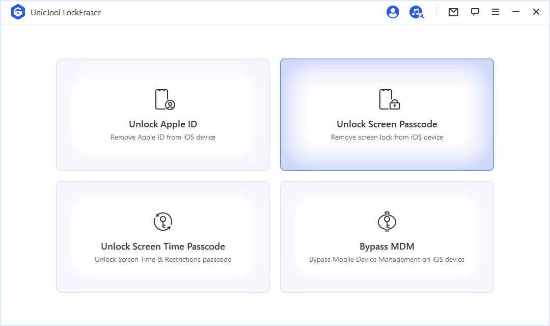 UnicTool LockEraserje sofistikovaný program speciálně navržený k efektivnímu a bezpečnému řešení široké škály problémů a problémů se zámkem iPhonu, mezi něž patří dostat se do iPhonu, pokud jste zapomněli svůj přístupový kód, odemknout své Apple ID, odemknout přístupový kód Screen Time a obejít zámek MDM. Díky extrémně snadnému použití dokáže LockEraser odemknout váš iPhone přímo za pouhých několik minut.