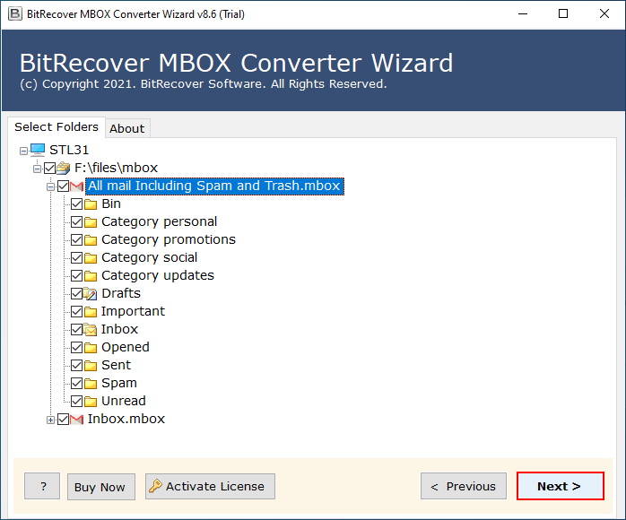 - Poté povolte pouzepožadované složkyz panelu náhledu spusťte proces převodu poštovní schránky GyazMail na PST.