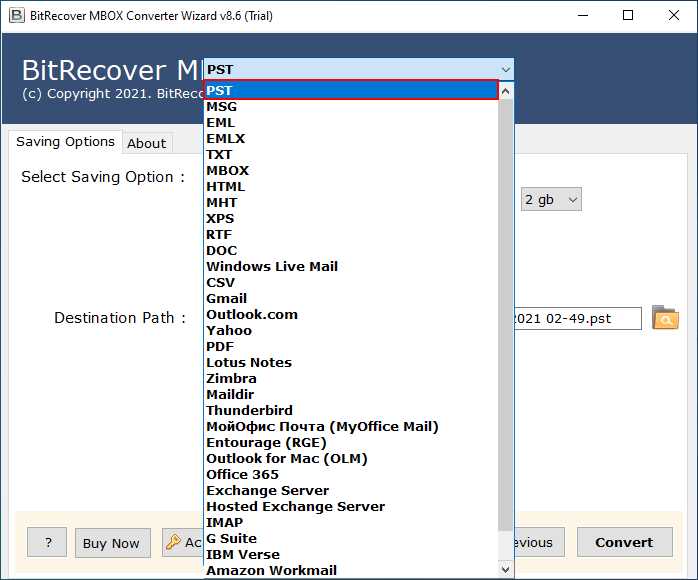- Nyní přejděte do seznamu možností uložení azvolte PSTjako možnost uložení ze seznamu možností.