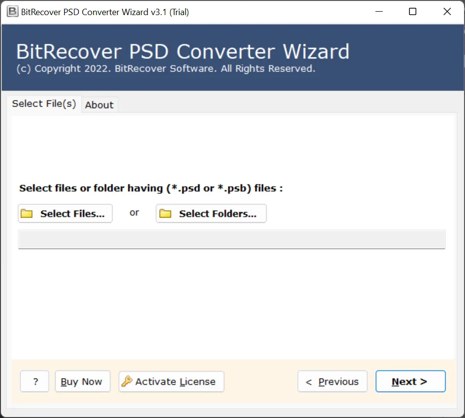 - Software má dvě možnosti, tj. Vybrat soubory nebo Vybrat složky pro snadné nahrávání souborů Photoshop PSD v softwarovém GUI.