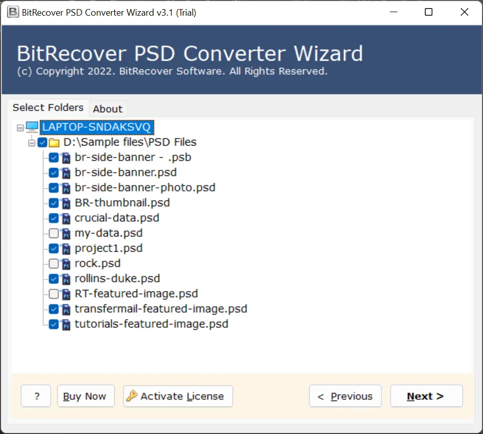 - Před zahájením procesu převodu PSD na BMP software zobrazí všechny PSD na softwarovém panelu. Uživatelé mohou pro převod PSD na bitmapu vybrat pouze konkrétní soubory.
