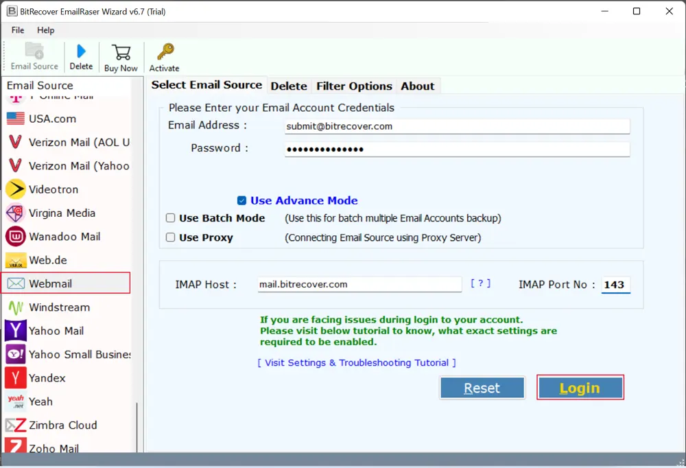 - VybratWebmailjako zdroj e-mailu ze sady nástrojů a zadejte e-mailovou adresu a heslo. Vyplňte také IMAP Host a IMAP Port No. a klikněte naLnevímpokračovat.