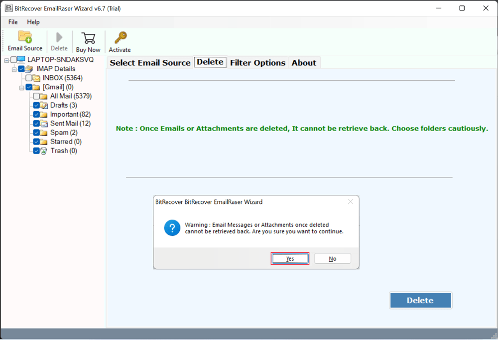 - Webmail Email Eraser zobrazí avarovná zpráva– „Jakmile jsou e-maily smazány, nelze je získat zpět“. Klepněte naAnotlačítko pro potvrzení.