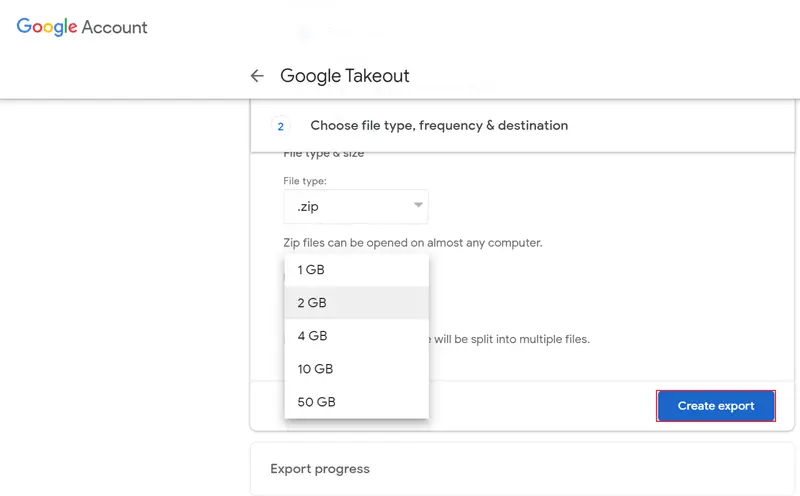 - Poté vyberte amaximální velikostpro exportované konverzace Google Chat, tj. 1 GB, 2 GB, 4 GB, 10 GB a 50 GB.