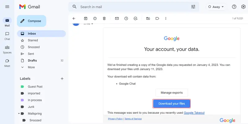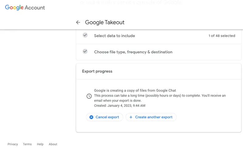 Fáze 1: Exportujte chaty Google do souborů JSON pomocí Exportu dat