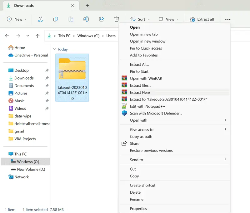 - Získejte exportované chaty s vytažením ze složky pro stahování aextrahujte soubor ZIP.