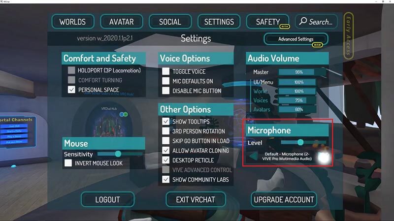 Oculus Quest nemá nic společného s hrami pro nastavení vstupu. Otevřete hru, kterou chcete hrát, pomocí VR headsetu. Přejděte do nastavení zvuku a videa a jako výchozí vstupní zařízení vyberte Virtuální zvukové zařízení (WDM) měniče hlasu.