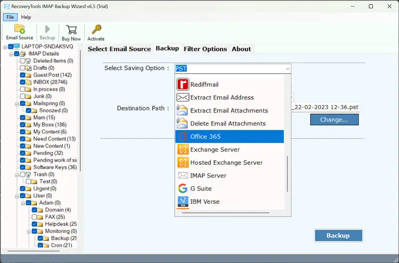 - Po úpravě nastavení přejděte k možnostem uložení, kde zadáte svou e-mailovou adresu Office 365; poté spusťteProces zálohováníjednoduchým klepnutím.