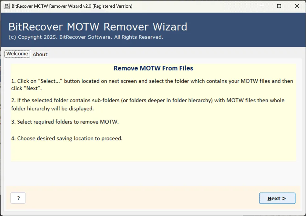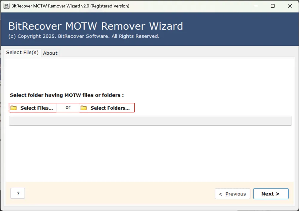 Pro profesionálnější uživatele, kteří se pravidelně setkávají s chybami, jako je nemožnost načíst .resx, protože není důvěryhodný. Můžete použítBitRecover Mark of the Web Removerk odstranění značky webu ze souborů RESX. Tento inteligentní nástroj podporuje dávkové odstranění MOTW as podrobnou zprávou včetně pole ID zóny, adresy URL hostitele, data vytvoření, data změny atd. Uživatelé mohou tuto snadno použitelnou aplikaci používat na svém počítači.
