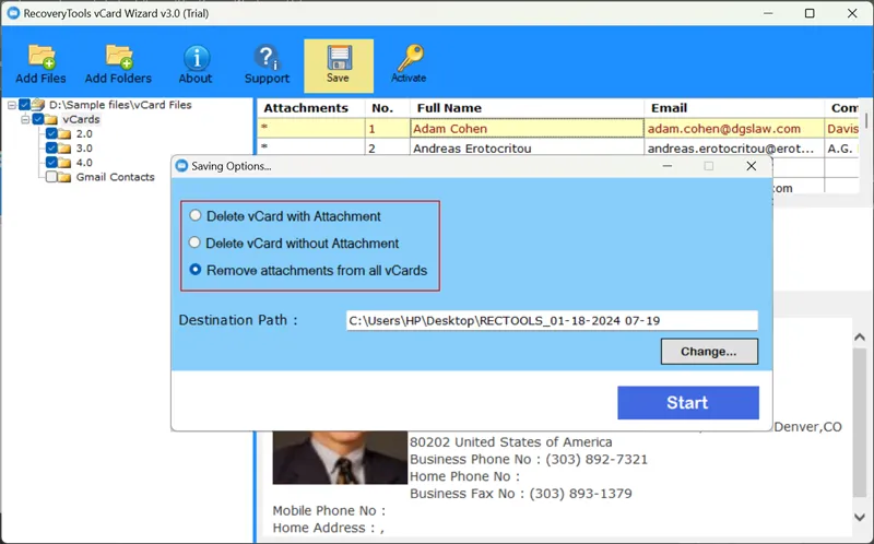 - ZahájitOdstraňovač příloh vCardapřidat soubory vCardpomocí duálních režimů.