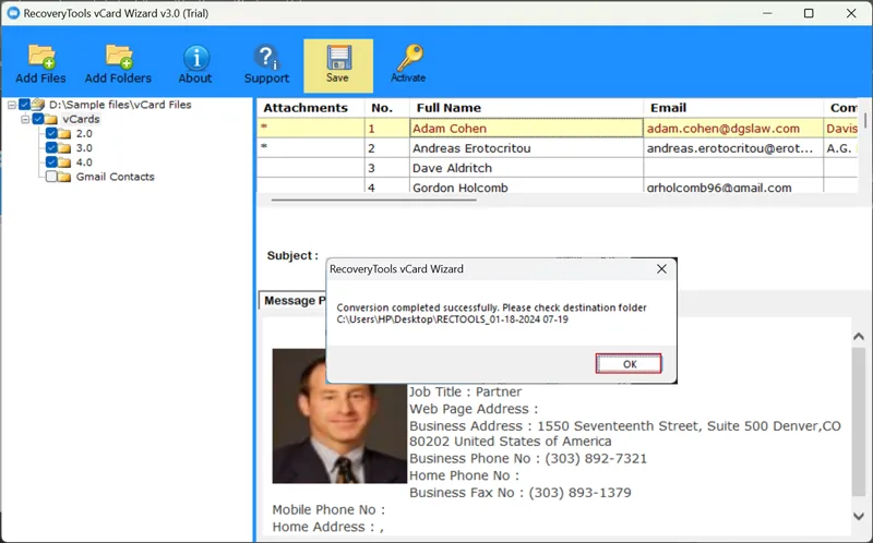 Tento VCF Attachment Remover je dodáván s 30denní zkušební verzí, která vám umožní odstranit profilové fotografie VCF z 5 kontaktů. To je výhodné otestovat tento software před upgradem na profesionální verzi. Demoverze však funguje stejně jako plně aktivovaná verze.