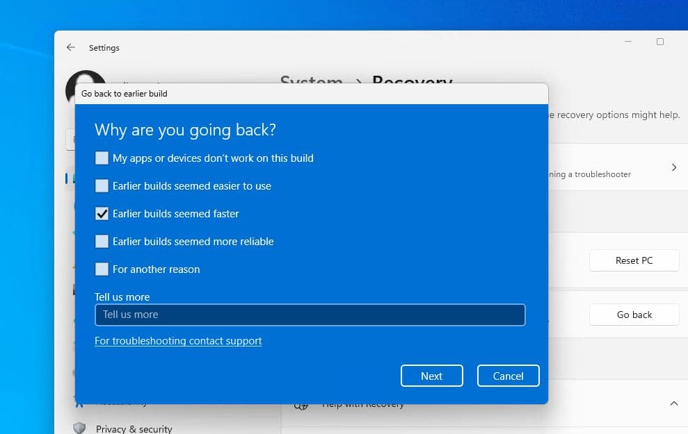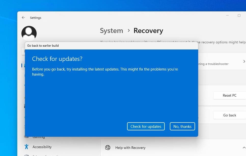 Nastavení obnovení v systému Windows 11 poskytuje možnost odinstalovat nejnovější aktualizaci a přejít na starší verzi