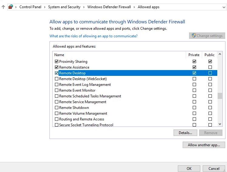 - Brána firewall systému Windows nyní umožňuje vzdálené připojení k tomuto počítači pomocí protokolu vzdálené plochy.