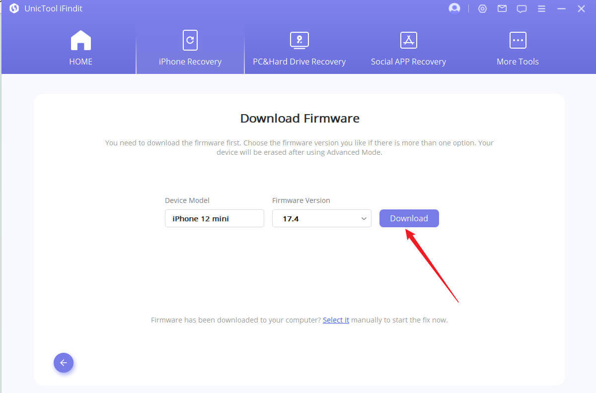 - Stáhněte si iFindit a nainstalujte jej do počítače se systémem Windows nebo Mac. Připojte svůj iPhone k počítači kabelem. Vybrat"Obnovení iPhonu"možnost, výběr"Opravit systém".