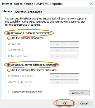 - Zde se ujistěte, že jste vybrali možnost Získat adresu IP automaticky a Získat adresu serveru DNS automaticky.