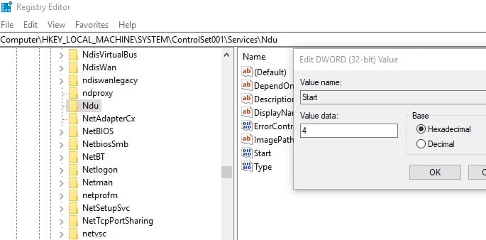 - HKEY_LOCAL_MACHINE>SYSTÉM>ControlSet001 > Služby > Ndu.