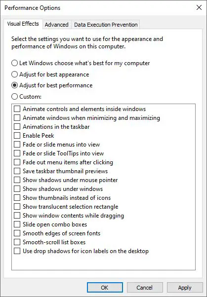- Poté zvolte Upravit pro nejlepší výkon. Klepněte na tlačítko Použít → OK.