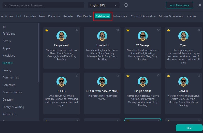 Vyzkoušejte online generátor komentáře celebrit VoxMaker níže. Pozoruhodné je, že máte 3 bezplatné zkušební verze. Chcete-li získat přístup k dalším hlasům celebrit, klikněte níže na „Vyzkoušet více hlasů“ a stáhněte si software zdarma.