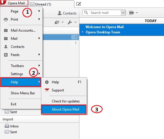 - Nyní otevřetePanel nabídeka přejděte naNápověda >> O Opera Mail.