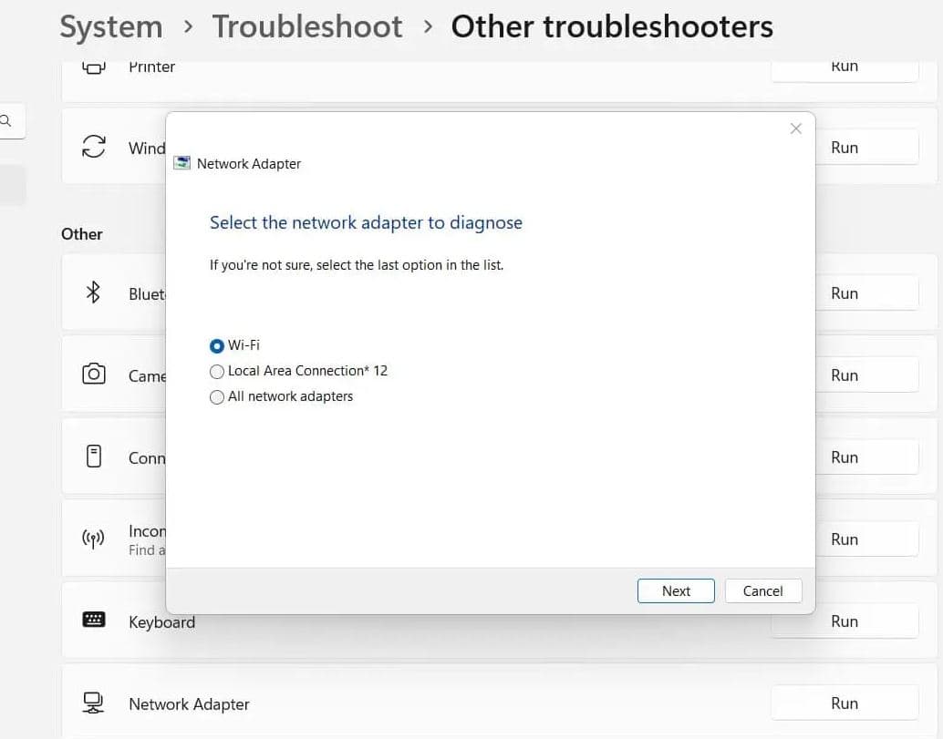 Opět platí, že spuštění nástrojů pro odstraňování problémů systému Windows vám může pomoci vyřešit různé systémové problémy. Spusťte nástroj pro odstraňování problémů se síťovým adaptérem, který diagnostikuje a pomůže obnovit chybějící ikonu Wi-Fi.