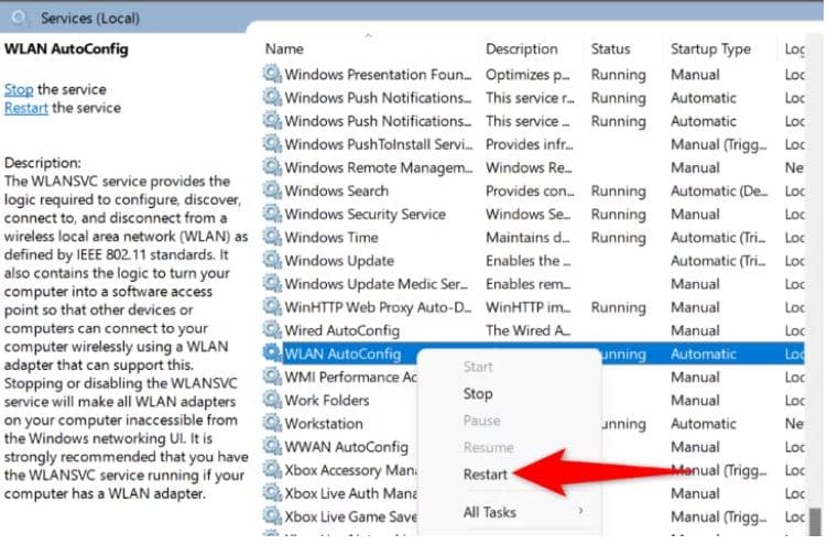 - Přejděte dolů v seznamu služeb, klepněte pravým tlačítkem myši na Automatickou konfiguraci WLAN a vyberte možnost Restartovat. Pokud se možnost zobrazí šedě, zvolte Start.