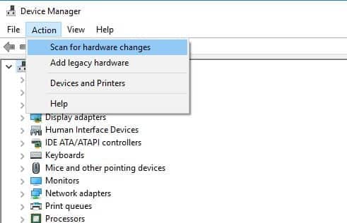 Pokud ne, otevřete znovu Správce zařízení a klikněte na AkceVyhledejte změny hardwaru,a zkontrolujte, zda je problém vyřešen nebo ne.