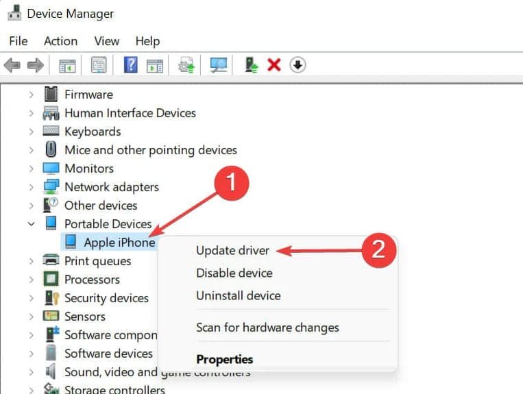 - Rozbalte přenosná zařízení, klikněte pravým tlačítkem na svůj iPhone a poté klikněte na Aktualizovat ovladač.