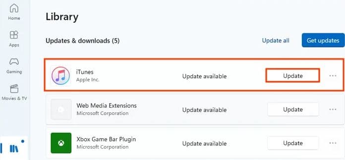 Spuštění starší verze aplikace iTunes může být důvodem, proč Windows 11 nerozpozná iPhone. Pojďme aktualizovat aplikaci iTunes na nejnovější verzi z obchodu Microsoft Store.
