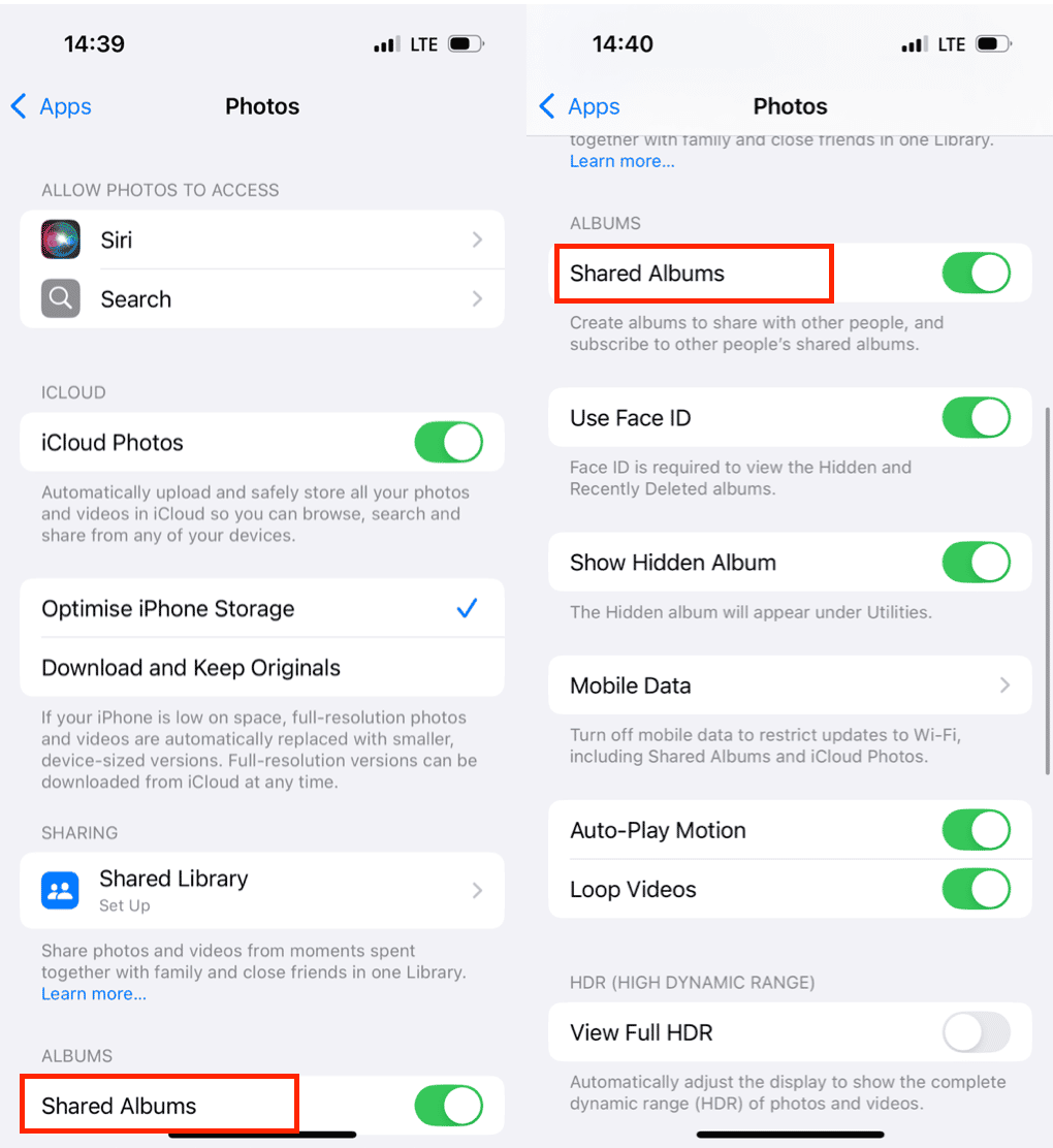 - Klepnutím přepínáte sdílená alba na pozici ON.