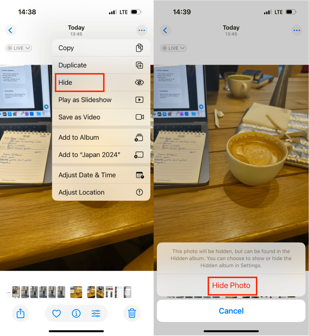 - Klepněte na skrýt fotografii na vyskakovacím tlačítku.
