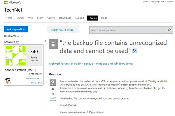 Jak wszyscy wiemy, jeśli utworzono kopię zapasową jakichkolwiek danych, ryzyko ich utraty jest bardzo mniejsze. Wcześniejsi użytkownicy tworzyli kopie zapasowe swoich danych w formacie BKF za pomocą wbudowanego narzędziaNarzędzie NTbackupw systemie Windows XP, po czym, gdy potrzebowali danych, przywracali je za pomocą narzędzia NTBackup. Jeśli podczas tych dwóch kroków Twój plik zostanie uszkodzony, zainfekowany wirusem lub wystąpi jakikolwiek inny problem, pojawi się ostrzeżenie „Plik kopii zapasowej zawiera nierozpoznane dane i nie można go użyć”.
