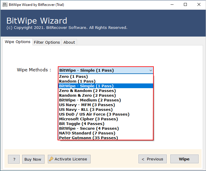 5. Wybierać "BitWipe Proste (1 podanie) ”Jako metoda wycierania.