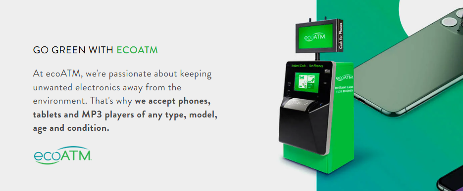 - kioski ecoATM:Ponieważ regularne aktualizacje stanowią część planów wielu smartfonów konsumentów, telefony komórkowe stanowią dużą część elektroodpadów. Kioski ecoATM to bezpieczny i wygodny sposób sprzedaży lub recyklinguniechciany telefon, tablet lub odtwarzacz MP3natychmiastowa gotówka.