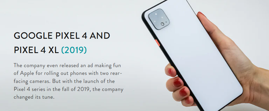 Google powoli przyjmował trend dodawania dwóch głównych aparatów. Firma wypuściła nawet reklamę, w której naśmiewała się z Apple za wypuszczenie telefonów z dwoma tylnymi aparatami. Jednak wraz z wprowadzeniem na rynek serii Pixel 4 jesienią 2019 roku firma zmieniła zdanie.