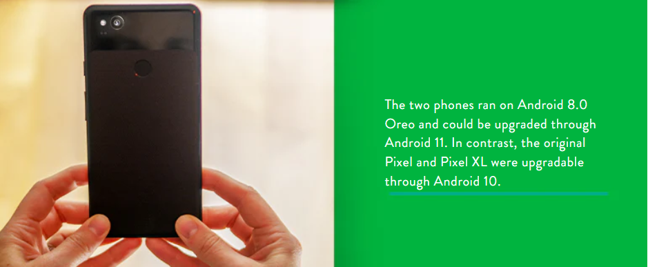 Obydwa telefony działały pod kontrolą Androida 8.0 Oreo i można je było zaktualizować do Androida 11. Z kolei oryginalne Pixel i Pixel XL można było zaktualizować do Androida 10. Podstawowy model Pixel 2 miał dwukrotnie większą przestrzeń dyskową niż oryginalny model, 64 GB zamiast 32 GB. Oznacza to, że na Pixelu 2 możesz przechowywać dwukrotnie więcej muzyki, zdjęć i aplikacji.