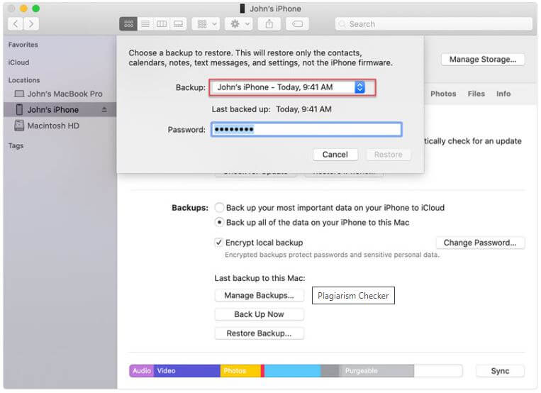 - Krok 2: Wybierz iPhone'a w polu iTunes, a następnie kliknij Przywróć kopię zapasową. Poniższe okno wyświetla listę kopii zapasowych. Wybierz najnowszą i naciśnij przycisk Przywróć. Jeśli pojawi się monit o podanie hasła, wprowadź hasło do zaszyfrowanej kopii zapasowej.