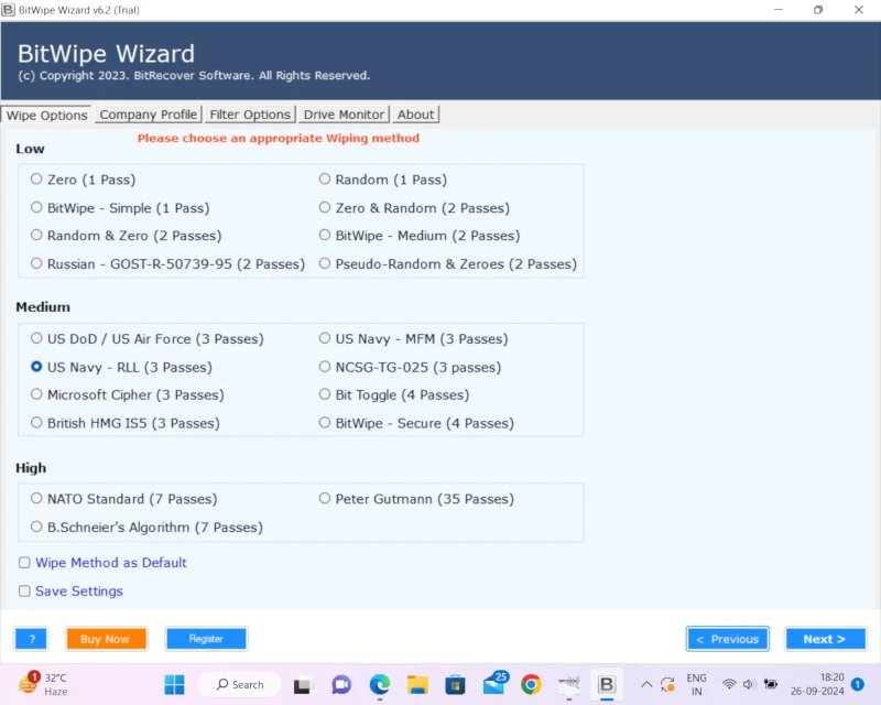 • Obsługuje zatwierdzone przez branżę algorytmy wycierania, takie jak DoD 5220.22-M i NIST.