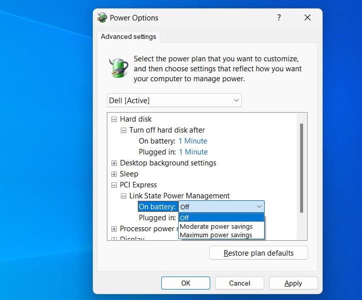 - Rozwiń PCI Express → Zarządzanie energią stanu łącza → ustaw na Wyłączone.
