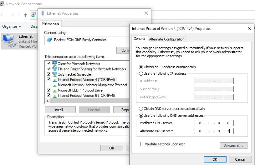 - Wybierz przycisk opcji Użyj następujących adresów serwerów DNS i ustaw preferowany serwer DNS 8.8.8.8, Alternatywny serwer DNS 8.8.4.4