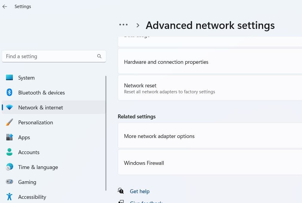 - Przejdź do zakładki Sieć i Internet po lewej stronie i przejdź do Zaawansowanych ustawień sieci.