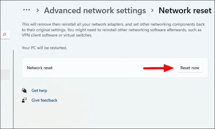 Na koniec kliknij przycisk Resetuj teraz obok opcji Resetuj sieć.