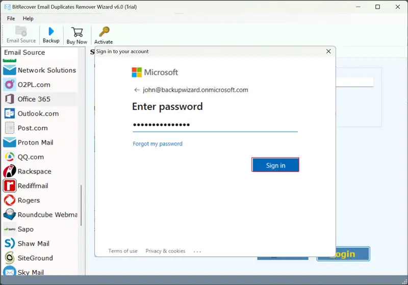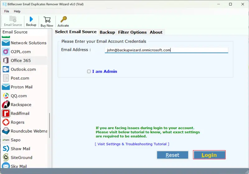 - WybieraćBiuro 365z listy Źródło e-maili i wprowadź adres e-mail. (Ponieważ mówimy o usuwaniu duplikatów udostępnionej skrzynki pocztowej, tutaj wprowadzany jest adres e-mail tej samej skrzynki).
