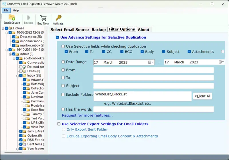 - WłączUżyj ustawień zaawansowanychw polu Duplikacja selektywna, aby usunąć zduplikowane wiadomości e-mail udostępnionej skrzynki pocztowej między dwiema określonymi datami.