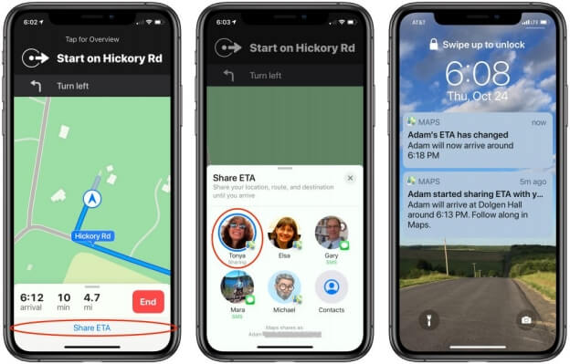 - Udostępnij po drodze:Gdy udajesz się do miejsca docelowego, możesz udostępnić swój szacunkowy czas przybycia (ETA) za pomocą Apple Maps. Spowoduje to udostępnienie Twojej aktualnej lokalizacji i przystanków na trasie. To fantastyczny sposób, aby poinformować kogoś dokładnie o swoim przybyciu.